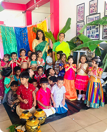 Our Play Group and Kindergarten curriculum follows a play-based approach incorporating AMI techniques and thematic learning, fostering early development in a nurturing environment.