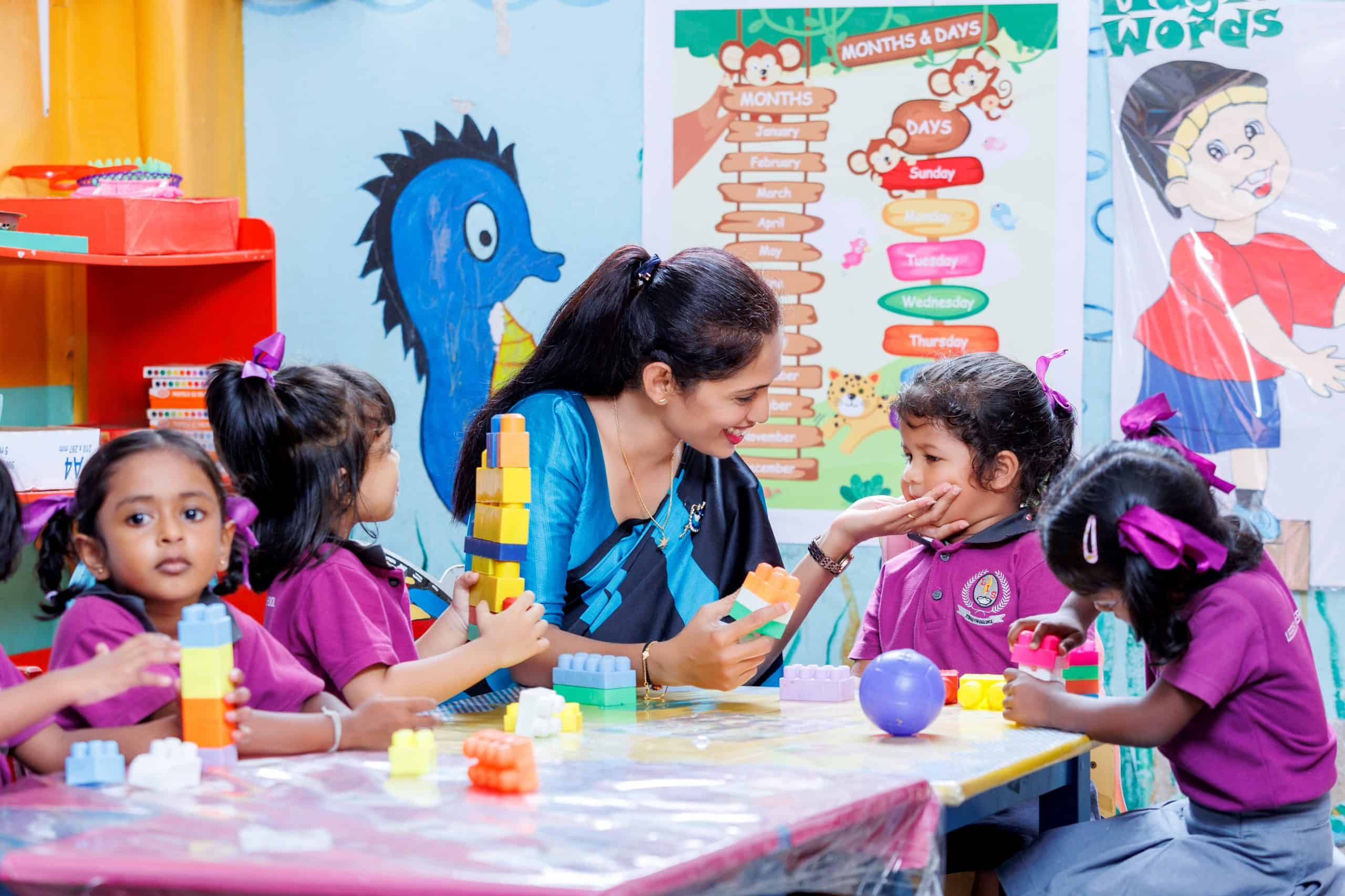 Our Play Group and Kindergarten curriculum follows a play-based approach incorporating AMI techniques and thematic learning, fostering early development in a nurturing environment.